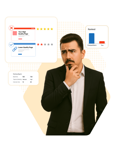 Lower-quality pages win through links, topical authority and intent fit. We rebalance authority, rebuild hubs and align pages to SERP intent to reclaim rankings.High sessions mean nothing if visitors can’t buy or it doesn’t help in building topical authority. Poor intent targeting attracts an irrelevant audience, crushing CVR and inflating CAC.